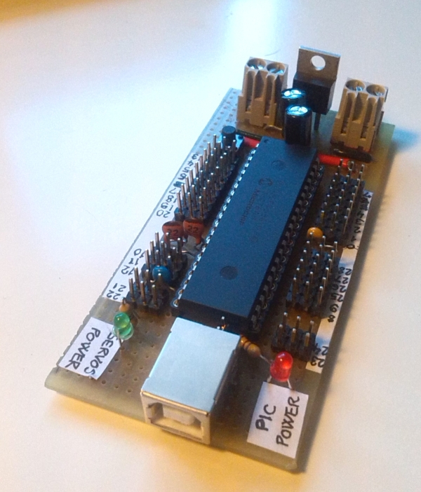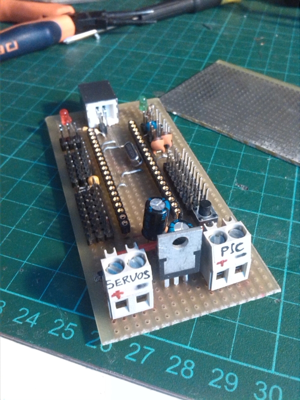 Regarding power supply, in order to keep stable the microcontroller supply and to avoid microcontroller resets or brown-outs due to current peaks provoked by servos, the PCB is designed with 2 different supply conectors: one for PIC and one for servos. So, batteries are needed for each power entry. PIC has its own regulator to 5Volts on board. Servos could be supplied with any requiered voltage. If they need 5 volts, this should be regulated outsite the board.