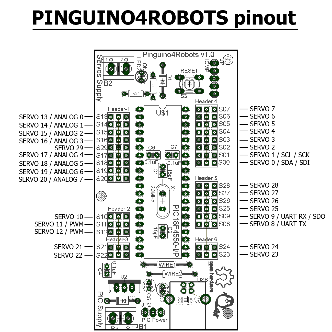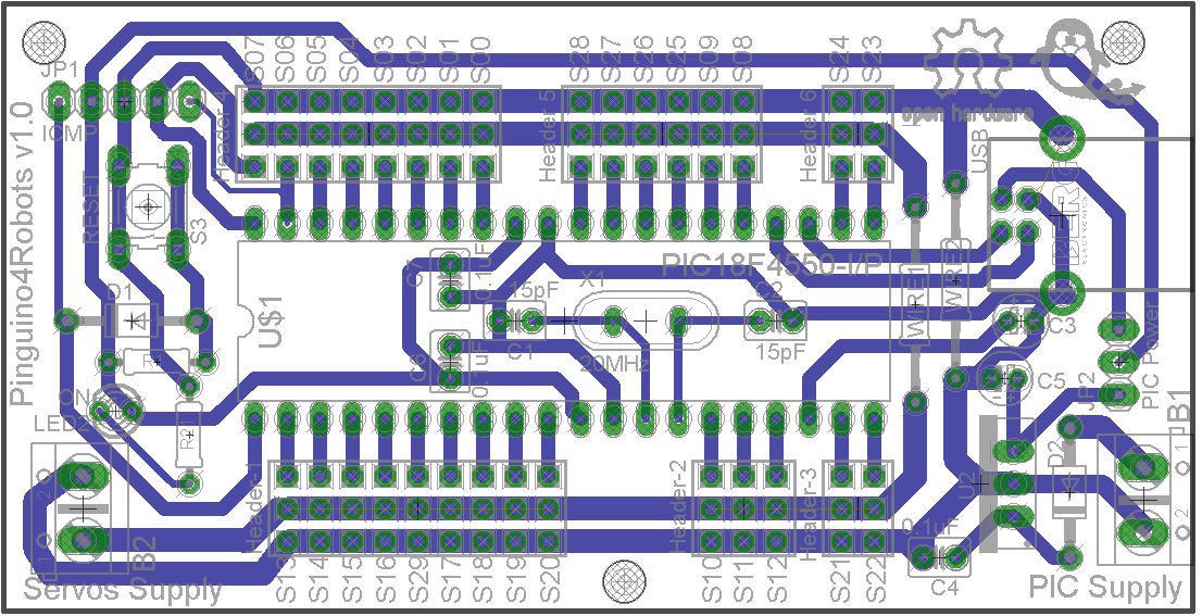 A raiz de otras entradas que ya habréis visto en el blog, tocaba ya diseñar una PCB Pinguino, para aprovechar todos sus pines de usuario, como servos. Es relativamente sencilla de hacer y nos resultará a fin de cuentas económica. Fácil de programar, puesto que nos basamos en el IDE de Pinguino. Y además, totalmente Open Source Hardware. Es decir, os podéis bajar el diseño y modificarla… En cualquier caso, el resultado es este, Pinguino4Robots: como controladora de hasta 30 servos (opcionalmente algunos puertos pueden ser utilizados como sensores).